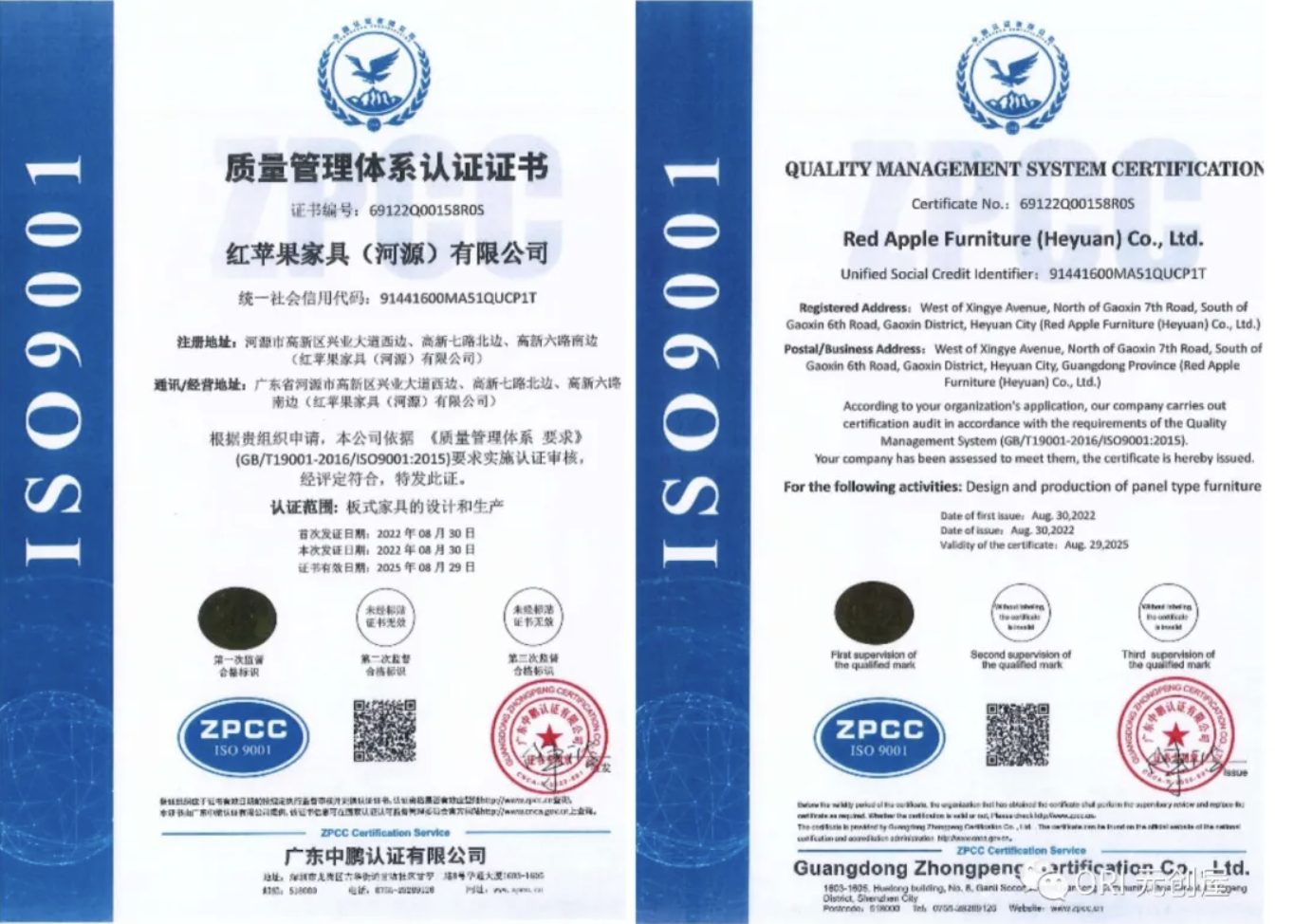近日,在全體員工的共同努力下,ORI元創(chuàng)屋品牌工廠【紅蘋果家具(河源)有限公司】正式通過【GB/T24001-2016/ISO14001:2015環(huán)境管理體系】與【GB/T19001-2016/IS09001:2015質(zhì)量管理體系】雙認證,榮獲"ISO14001環(huán)境管理體系認證”與“ISO9001質(zhì)量管理體系認證”雙證書。